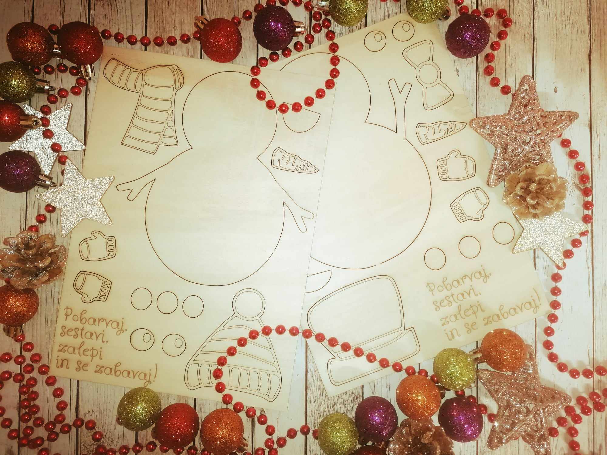 je ustvarjalni praznični projekt za otroke in odrasle. Izrezan iz kakovostne vezane plošče v velikosti A3, vsebuje podobo snežaka ter izrezane oblike božičnih okraskov, ki jih lahko sami pobarvate in nato pritrdite na snežaka. Na voljo 2 različni verziji.